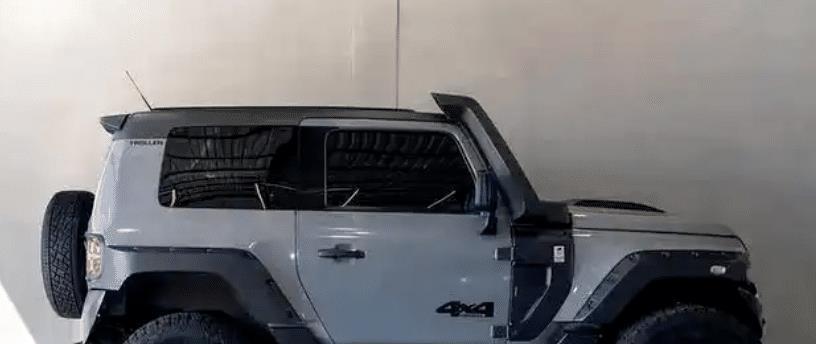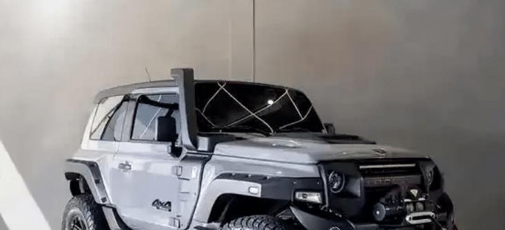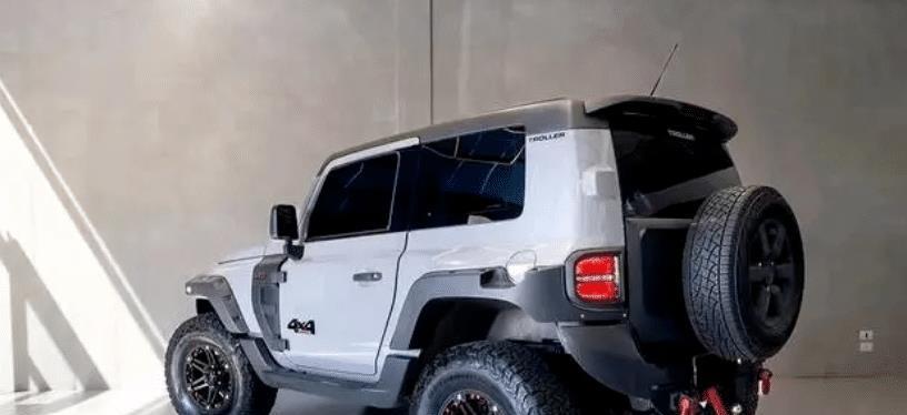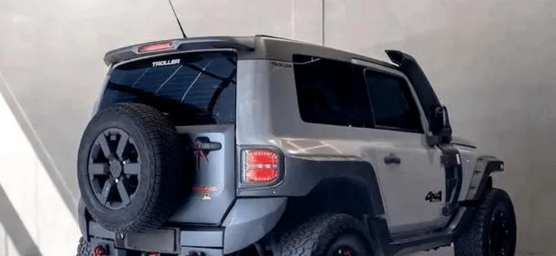 车尾也是短小精悍,车顶有个上翘的熏黑扰流板,运动感爆棚。尾门是侧开的,挂着个全尺寸备胎,看着就粗犷。尾灯也是大尺寸的,周围用黑色饰板包裹,立体感杠杠的。保险杠跟大灯形状呼应,红色拖车环和拖车钩,都在告诉你,这可不是辆普通的SUV,这是正儿八经的越野车!